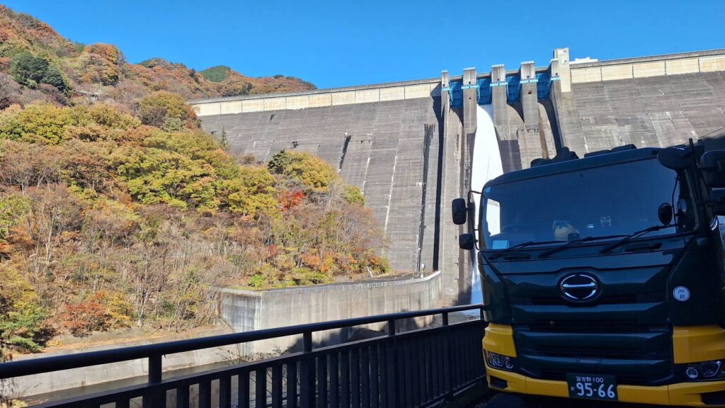 そして本社所属のトラックをバックに群馬県のダムと紅葉の景色。